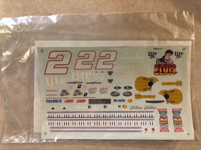 Very rare sheet made by Madame decals to do Rusty Wallaces Lite beer Elvis scheme, from Las Vegas in 1998. Should work with any Revell round headlight Taurus model. 1/24 scale. These decals are quite old, and will need special care before and when applying. Sold as is!
