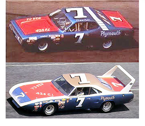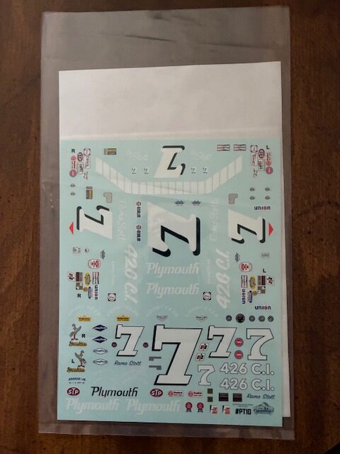 #7 Ramo Stott Plymouths. Sheet can do two complete cars, the Superbird and the Road Runner. High end Cartograf printing. 1/25 Scale.